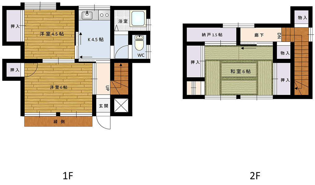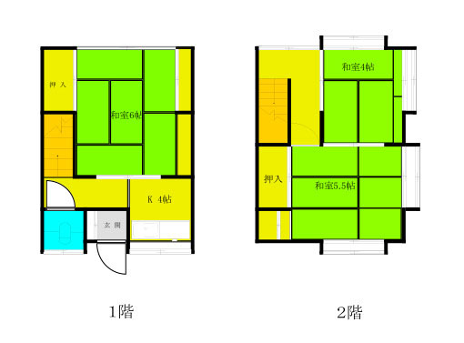 1F 洋6・洋4.5・K4.5・風呂(シャワー)・トイレ(洋・水洗) 2F 和6・納戸 |