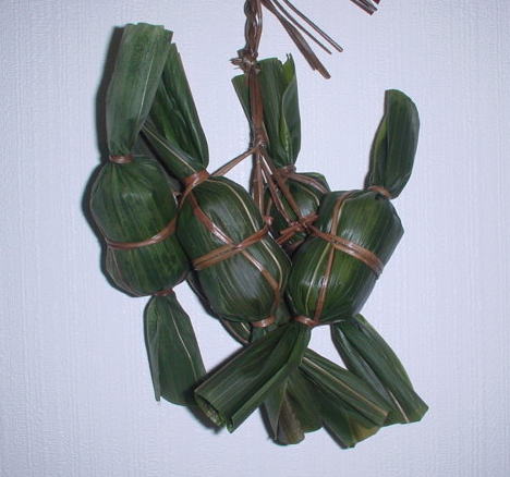E餡をくるんだ生地を笹で2〜3枚でくるむ。笹は、よく水を切りタオル等で表面をよく吹いて表面を中にして使う。