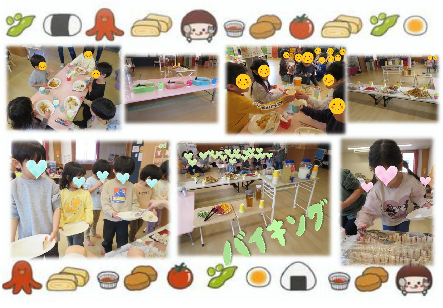 お楽しみバイキング 年少さん以上で今日はバイキングを楽しみました。 いつもの給食とは違い、自分の好きな食べ物を選ぶことが出来るのでみんなの目はキラキラ。 おにぎりやサンドイッチ、唐揚げにコロッケ、ウインナー、フライドポテト、ブロッコリートマト フルーツと三色ゼリーもおかわり自由、ジュースも飲んで何度も並んで選ぶことを楽しんでいました。 食べている時もたくさんの「おいしい」の声が聞こえていましたよ。食べ終わると作ってくれた給食さんに 「ありがとう、おいしかった~」と伝えていたのがとても微笑ましかったです。