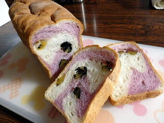 ★紫芋食パン 発酵種を使って伸びのある生地を作ります。 紫いもパウダー生地と白生地のコントラストが美しい 中にさつまいも甘煮と黒ごまを巻き込んで おしゃれなパンが出来ました。 |