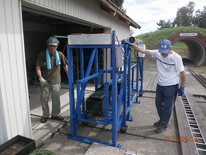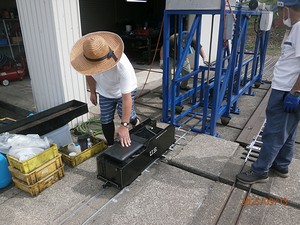 渡りの線路を使って、車からリフト付きのトラバーサーにエンジン部(100kg)を乗せました。