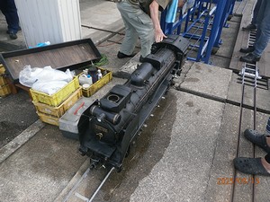 リフトで地上の線路まで下げた後、テンダーを降ろしています。