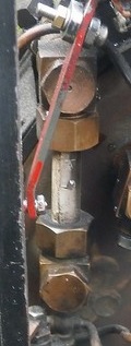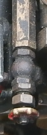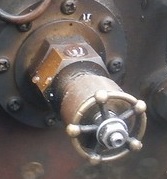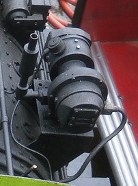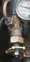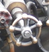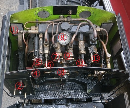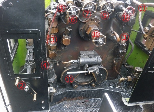 ![]() ![]() 引き続き、D51199の運転室の各機器を見ていきます。 B : 水面計 ![]() 水面計です。左右に2つあります。 水位を知る上で、とても重要な機器で、火を入れたら火を落とすまで、常に監視します。 C : ブレーキ弁 ![]() ブレーキ弁です。 小さな機関車なら両足を地面に着けて止めることができますが、このぐらい大きな機関車では無理で、ブレーキは必須です。 運客走行を開始する前に、必ず効き具合いをチェックしておきます。 D : 動力式焚口戸作用弁? ![]() このバルブは、何でしょうか?。 動力式焚口戸作用弁でしょうか?。 E : インジェクタグローブバルブ? ![]() このバルブを出た後の配管は非公式側に向かっており、従輪の近くにインジェクタがありますので、 インジェクタグローブバルブかもしれません。 F : ターボジェネレータグローブバルブ ![]() ターボジェネレータグローブバルブです。 ![]() ターボジェネレータは、ボイラー上、やや非公式側寄りにあります。 G : 圧力計 ![]() ボイラーの圧力計です。 0.4〜0.6MPaのところが赤く塗られています。このあたりが常用蒸気圧かと思われます。 水面計と同様、常に監視します。 H : ドンキーポンプグローブバルブ ![]() ドンキーポンプグローブバルブです。 I : 加減弁ハンドル ![]() 加減弁ハンドルです。 加減弁はネジ式のようです。 (その6へ戻ります) (その8に続きます) |