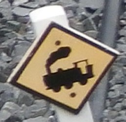 線路脇の”踏切あり”の道路標識(↓)が可愛らしいです。