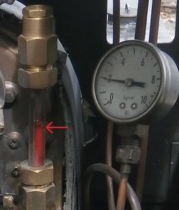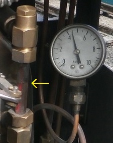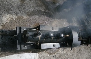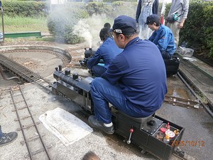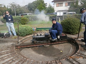 ![]() 引き続き、タカダモケイ 5インチゲージ C形タンク機関車の運転室の各機器を見ていきます。 L : 圧力計 ![]() ボイラーの圧力計です。 最大目盛は10kgf/cm2で、 画像では4.4kgf/cm2ぐらいを指しています。 M : ハンドポンプ ![]() ハンドポンプです。 ボイラーに給水する重要な機器です。軸動ポンプは走行しないと給水できなく、 また、ドンキーポンプとインジェクターは蒸気がないと給水できないのに対し、 いつでも給水可能なことが特徴です。火を入れる前に、正常に動作することを確認しておきます。 ![]() さて、ボイラーに火を入れて、スチームアップを進めています。 ![]() ![]() ![]() 走行準備が整ったようです。これから、ターンテーブルに乗ります。 ![]() そして、ターンテーブルに乗りました。 ![]() ターンテーブルを回しています。 ![]() ターンテーブルから降りていきます。