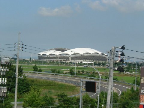 | 昨年のワールドカップの会場の一つ「ビッグスワン」。真横から見ると白鳥が羽を広げたように見える ところからの命名であろう。北陸自動車道に亀田ICから乗った直後の画像である。 |