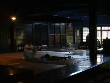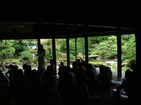 | ちょうど小学校の校外学習であろうか、奥座敷は小学生で埋まっていた。しかし、日本の蒸し暑い夏に は、こうして開け放つことができる日本家屋が打って付けである。外の明るさと内の暗さのコントラストがさ らに内の涼しさを増幅させるように思う。 |