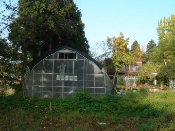 | 前出の写真のハウス内部。ほとんど片付いている。こちらは昨年の夏にNさんが一人で組みたてられたハウスで、以前からあるもう一棟のハウスは一部手付かずといった状況であった。 Nさんのパワーからすれば、そんなに時間を要せず復旧することが見込まれる。Nさんの言からすれば、9割方片付いているとのこと。こうした(地震災害の)状況下で、多少不謹慎かもしれなかったが、それが分かった段階で、少し遊ばせていただいた。 |