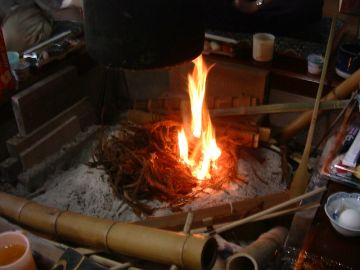 | 突然ですが、囲炉裏の火を囲んでの昼食まで跳びました。初めは作業の流れに乗るため、カメラを写している余裕が無かったことによります。 |