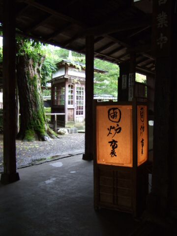 「囲炉裏」とは確か蕎麦処だったと思います。外に見える格子扉の建築物は電話ボックスです。その他、パン工房、ガラス工房、レストランなどが揃っています。レストランで食事をしたら入場料大人800円が250円割引になりました。他の施設でもきっと特典があると思います。 |