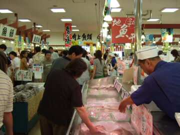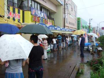| 寺泊の魚市場。雨降りだというのに駐車場はイッパイ。通りは傘と人でイッパイでした。 |