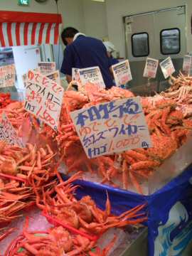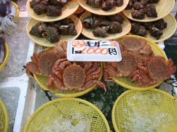 値札の乗っている左側のザルのケガニを買ってきました。チョット小ぶりで安かったのですが、ミソの部分が美味かった。 |