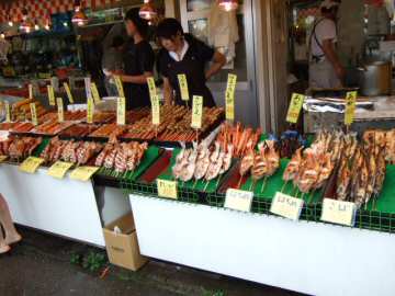 サカナの立ち食い用の串の数々。今年はダイエット中なもんで買いませんでした。 |