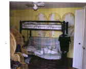 <ベッド部分> 整理して撮れば良かった〜と後悔(>_<)パイプ2段ベッドと左手壁側にシングルベッドがあります。写真では籐椅子の陰で見えず! (スミマセン) |
