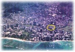 <アロハエアーからワイキキを望む>![]() 黄色の丸印がアロハラニです。隣に見えるのはアイランドコロニー(って小さくてわかんなーい!) |