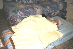 マット2枚を敷いて娘就寝中! リクエストしたマットはハードタイプで寝心地は良い感じ!毛布や布団、枕も予備の物があります。ダブルタイプのベッドの横にはシングル布団が二つ程度置けるスペースあり、小さなお子さんがいてもこれなら安心かもね。虫関係はみかけませんでした。クロゼットとタンス有り。大きくて我が家はもてあまし気味・・(~_~;)テレビもあります。通路に面している窓が高い位置にありますが、昼間でもちょっと日が入らないので暗い感じです。窓を開けていると夜間こちらの窓からの騒音が少し気になるかな?(Aloha Dr側)床はこの画像でみられるように全て石畳風タイル。(殆ど感覚は石畳)スリッパ等を持参すると快適だと思います。 |