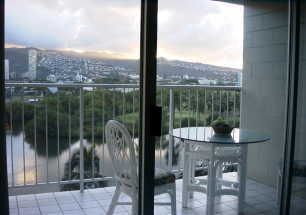 ラナイはそこそこ広いスペース、階下は駐車場の為夜間はちゃんと施錠してね。今回風が結構強かったです。曇り空も多く、ご来光はあまり見ることが出来なかった(-_-;)。早朝のアラワイ運河沿いは人間ウォッチングしてると面白い・・アウトリガーカヌーの練習をしている学生さん、ジョギングしている人、見ていると飽きない?(変な人かなぁ〜?→私(~_~;))柵は153cmそこそこしかない私の胸あたりまであります。柵の幅もお子さんが入り込むには少し狭い感じがしますから大丈夫かと思いますが、くれぐれもお子さん1人でラナイで遊ばせる事はやめましょうね。窓の施錠もしっかり忘れずに! |