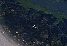| ナントカ川?謎 | 福島空港滑走路。肉眼で「うつくしまふくしま」の文字を確認できた。 |