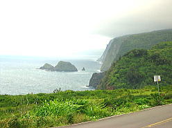 さて、270号線をリターンして、ハヴィの街で250号線に入ります。一路ワイメアをめざしましょう。コハラマウンテンロードの名のごとく、くねくね道が続きます。道路幅も結構狭い感じです。う〜んこの感じ・・知床に行った時に山間を走っていた雰囲気とちょっと似てる・・・