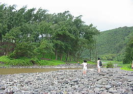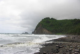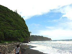 途中で悟りました・・ハイ!この道は確実に渓谷の下まで続いてます!!でも、ここまで降りてきたら引き返せません(涙)。道は相当ラフラフで、石もゴロゴロ足場も悪いです。こちら方面は緑が多いので、地面も湿っていて時には滑ります。道は狭く、直ぐ横が木々で覆われた崖状態ですので、充分に気をつけましょう。20分ほど歩いたでしょうか?下がりにさがったところに黒砂と岩ゴロゴロの海岸が見えました。渓谷は緑に覆われていてとても同じハワイ島とは思えないほどです。