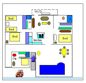 ガレージ前に車を止められるスペースは1台〜2台ですが、プール脇の道路(未舗装)も敷地内ですので駐車は可能です。三台くらいはゆうに止められます。「jag」と書かれた所は離れのお部屋で、ジャグの近くにドアがあります、黄色はベッドです。このお部屋の下にガレージがあります。矢印は階段、紫色はクロゼット、緑は洗面台、茶色は本棚及びタンスです。楕円や○はソファなどです。