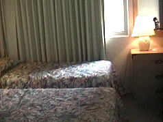 | ダブルのベッドルーム。クロゼットつき、窓からは壁びゅぅ! | リビング横に続いたエリアにシングルベッド2つ(ドア無し)。この右手側にクロゼットがあります。セーフティボックスもその中に。 |