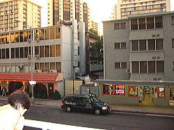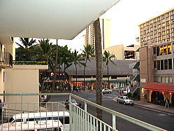 | お部屋のラナイビュー!左手側がオハナウエスト駐車場入り口。おばちゃんがシールを貼ってくれる。 | 正面ラナイからのビュー、グローサリーストアが目の前、便利なことは便利(むりやり) |
