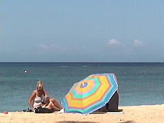 9時くらいにはオープンなんだろうなぁ〜と思いきや、到着したのは10時ちょっと前・・オープンは10時だった(涙)。オープンを待つ間ヒルトン横のビーチで少しのんびりする。娘は「足、つけていい?」と海に足をつけていく・・まぶしい程の白い砂に人もまばらなビーチ。この間トロリーから垣間見たワイキキビーチとは大違いだった。